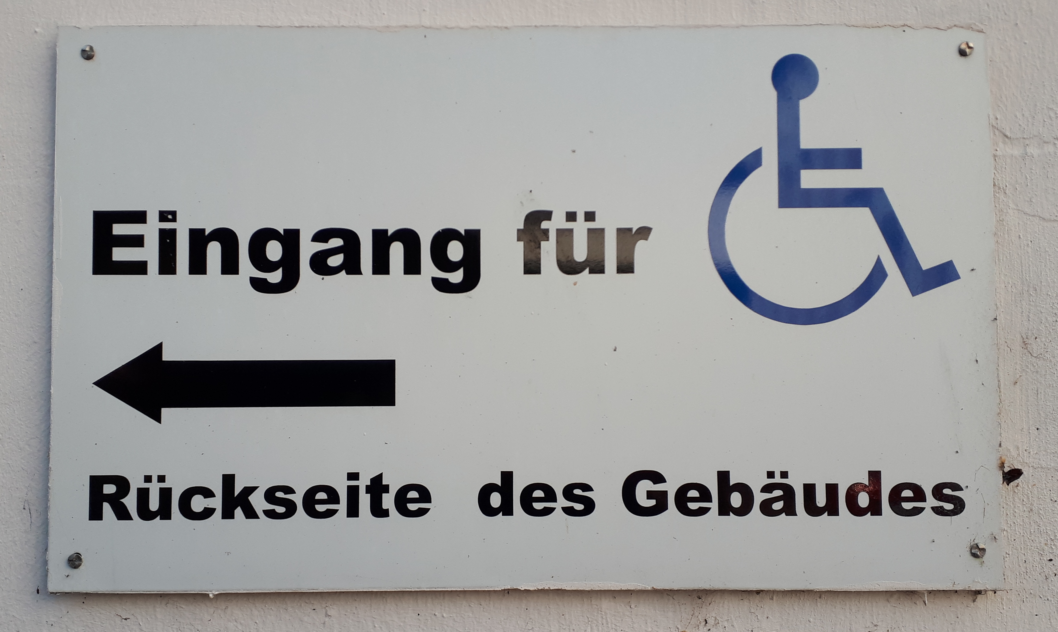 Gehbehinderten und Rollstuhlfahrern wird der Zugang zum denkmalgeschützten Gebäude durch den behindertengerechten Eingang auf der Rückseite des Gebäudes ermöglicht.